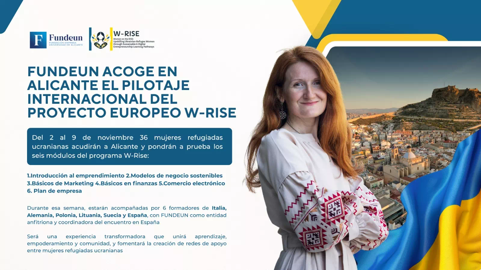 Desde el 2 hasta el 9 de Noviembre, FUNDEUN acoge en Alicante el Pilotaje Internacional del proyecto europeo W-RISE (Women on the Rise). Este proyecto Erasmus+ está dedicado a capacitar y empoderar a 36 mujeres refugiadas ucranianas y en situación de vulnerabilidad de 6 países, dotándolas de las herramientas para crear negocios sostenibles y digitales.